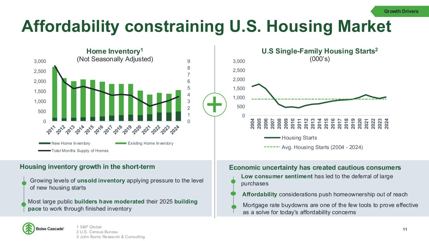 Multi-Family Growth Opportunity 24 Growth 0 100 200 300 400 500 600 Multi-Family Supply and Demand1 Multi-Family Units Built (Seasonally Adjusted) JBREC Annual Rental Demand Forecast Demographic tailwinds and market penetration opportunity Boise Cascade supplied 5% of all Multi-Family Wood Floors in 2023 by sq ft • 13% of multi-family I-joists2 17% 46% 5% 32%37% Multi-Family Wood Floor Penetration2 Open - Web Truss Dimensional Lumber I-joists BCC I-joists Non-BCC I-joists Demographic and immigration trends bolster undersupplied housing units in the US Starts are being delayed by the cost of capital, demand will pick up as cap rates become more attractive for investors Expected annual growth of 410K renter households through 20331 I-joists provide jobsite benefits over open web truss, decreasing build times and labor costs 1 JBREC – U.S. Demographic Insights 2 HIRL – Floor Systems Analysis 2023