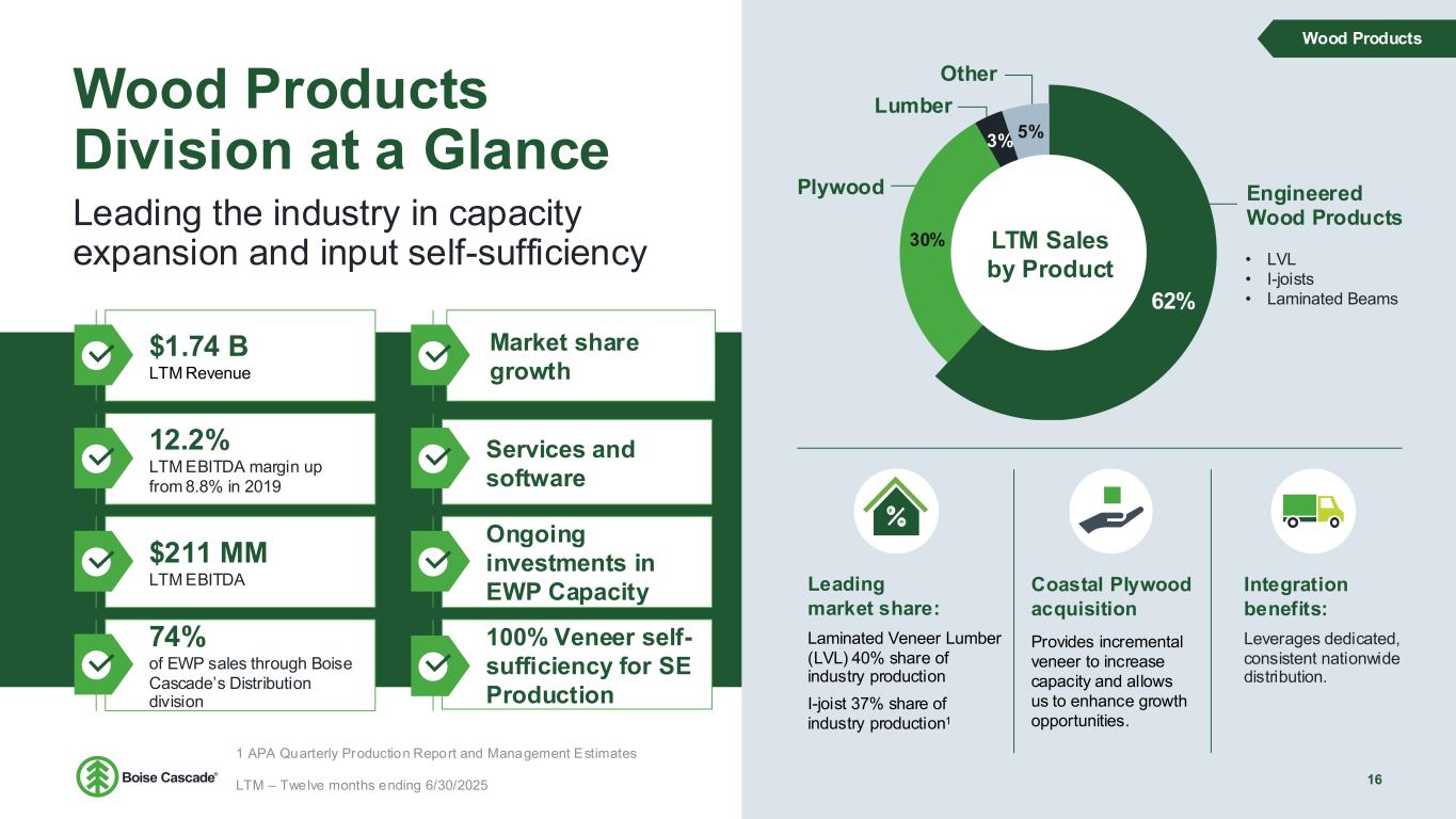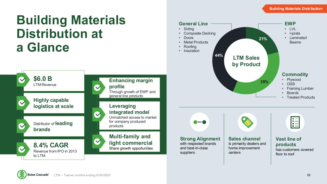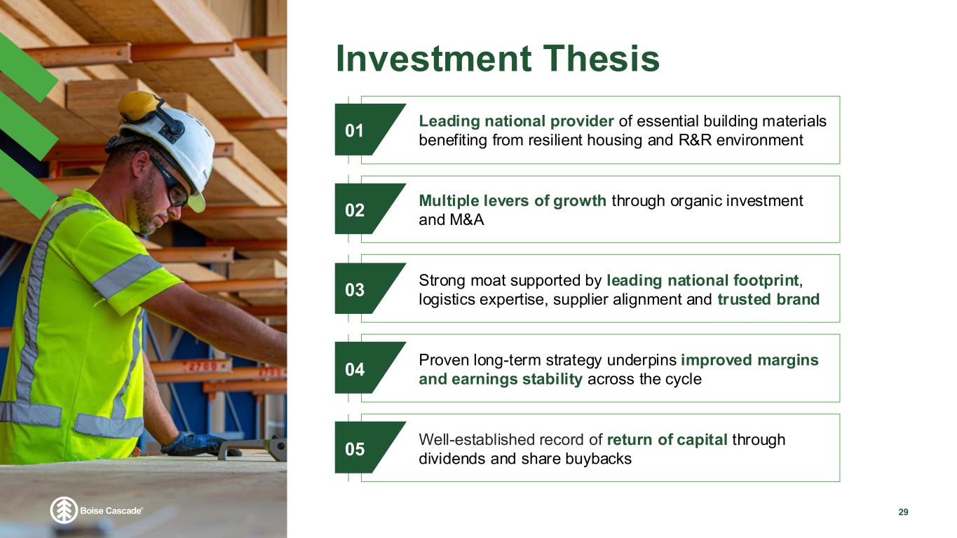 FORWARD-LOOKING STATEMENTS AND NON-GAAP FINANCIAL MEASURES 2 This presentation contains statements concerning future events and expectations, including, without limitation, statements re lating to third quarter 2025 outlook and expected key drivers for Boise Cascade and each of its business segments. These statements constitute forward-looking statements within the meaning of the Private Securities Litigation Reform Act of 1995. Any statements that express, or involve discussions as to, expectations, beliefs, plans, objectives, assumptions, or future events or performance, often, but not always, through the use of words or phrases such as "anticipates," "believes," "could," "estimates," "expects," "intends," “outlook,” "potential," "plans," "predicts," "preliminary," "projects," "targets," "may," "may result," or similar expressions, are not statements of historical facts and may be forward-looking. Forward-looking statements are not guarantees of future performance, involve estimates, assumptions, risks, and uncertainties, and may differ materially from actual results, performance, or outcomes. Factors that could cause actual results or outcomes to differ materially from those contained in f orward-looking statements include those factors set forth in Boise Cascade’s most recent Annual Report on Form 10-K, subsequent reports filed by Boise Cascade with the Securities and Exchange Commission (SEC), and the following important factors: the commodity nature of a portion of our products and their price movements, which are driven largely by general economic conditions, industry capacity and operating rates, industry cycles that affect supply and demand, and net import and export activity; the highly competitive nature of our industry; declines in demand for our products due to competi ng technologies or materials, as well as changes in building code provisions; disruptions to information systems used to process and store customer, employee, and vendor information, as well as the techn ology that manages our operations and other business processes; material disruptions and/or major equipment failure at our manufacturing facilities; declining demand for residual byproducts, particu larly wood chips generated in our manufacturing operations; labor disruptions, shortages of skilled and technical labor, or increased labor costs; the need to successfully formulate and implement succession plans for key members of our management team; product shortages, loss of key suppliers, and our dependence on third-party suppliers and manufacturers; the cost and availabil ity of third-party transportation services used to deliver the goods we manufacture and distribute, as well as our raw materials; cost and availabil ity of raw materials, including wood fiber and glues and resins; our ability to execu te our organic growth and acquisition strategies efficiently and effectively; failures or delays with new or existing technology systems and software platforms; our ability to successfully pursue our long-term growth strategy related to innovation and digital technology; concentration of our sales among a relatively small group of customers, as well as the financial condition and creditworthiness of our customers; impairment of our long-lived assets, goodwill, and/or intangible assets; substantial ongoing capital investment costs, including those associated with organic growth and acquisitions, and the diffic ulty in offsetting fixed costs related to those investments; our indebtedness, including the possibility that we may not generate sufficient cash flows from operations or that future borrowings may not be available in amounts sufficient to fulfi ll our debt obligations and fund other liquidity needs; restrictive covenants contained in our debt agreements; changes in foreign trade policy, including the impos ition of tariffs; compliance with data privacy and security laws and regulations; the impacts of climate change and related legislative and regulatory responses intended to reduce climate change; cost of complia nce with government regulations, in particular, environmental regulations; exposure to product liability, product warranty, casualty, construction defect, and other claims; and fluctuations in the mar ket for our equity. It is not possible to predict or identify all risks and uncertainties that might affect the accuracy of our forward -looking statements and, consequently, our descriptions of such risks and uncertainties should not be considered exhaustive. There is no guarantee that any of the events antic ipated by these forward -looking statements will occur, and if any of the events do occur, there is no guarantee what effect they will have on the company's business, results of operations, cash flows, financial condition and future prospects. Forward-looking statements speak only as of the date they are made, and, except as required by law, we undertake no obligation to publicly update or revise any forward-looking statements, whether because of new information, future events, or otherwise. This presentation includes references to EBITDA, Adjusted EBITDA and Segment EBITDA, which are non-GAAP financial measures within the meaning of the SEC’s Regulation G. Reconciliations of net income to EBITDA and Adjusted EBITDA and segment income to Segment EBITDA are included as an appendix.
