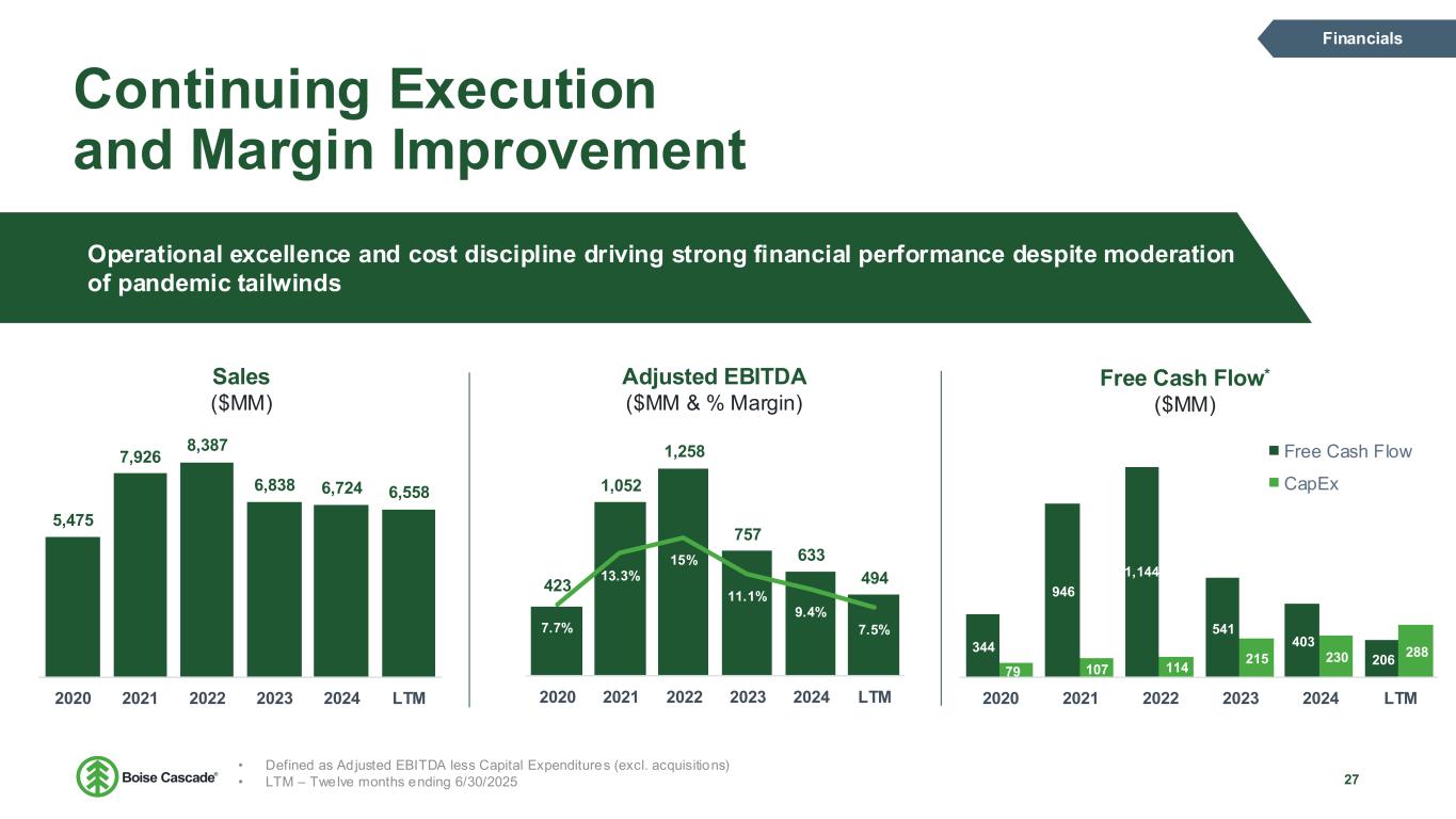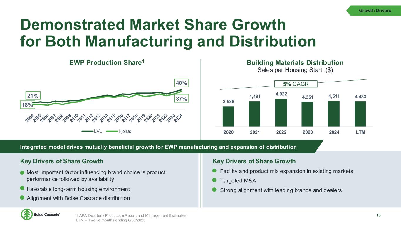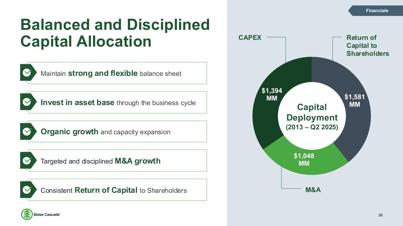 FORWARD-LOOKING STATEMENTS AND NON-GAAP FINANCIAL MEASURES 2 This presentation contains statements concerning future events and expectations, including, without limitation, statements re lating to third quarter 2025 outlook and expected key drivers for Boise Cascade and each of its business segments. These statements constitute forward-looking statements within the meaning of the Private Securities Litigation Reform Act of 1995. Any statements that express, or involve discussions as to, expectations, beliefs, plans, objectives, assumptions, or future events or performance, often, but not always, through the use of words or phrases such as "anticipates," "believes," "could," "estimates," "expects," "intends," “outlook,” "potential," "plans," "predicts," "preliminary," "projects," "targets," "may," "may result," or similar expressions, are not statements of historical facts and may be forward-looking. Forward-looking statements are not guarantees of future performance, involve estimates, assumptions, risks, and uncertainties, and may differ materially from actual results, performance, or outcomes. Factors that could cause actual results or outcomes to differ materially from those contained in f orward-looking statements include those factors set forth in Boise Cascade’s most recent Annual Report on Form 10-K, subsequent reports filed by Boise Cascade with the Securities and Exchange Commission (SEC), and the following important factors: the commodity nature of a portion of our products and their price movements, which are driven largely by general economic conditions, industry capacity and operating rates, industry cycles that affect supply and demand, and net import and export activity; the highly competitive nature of our industry; declines in demand for our products due to competi ng technologies or materials, as well as changes in building code provisions; disruptions to information systems used to process and store customer, employee, and vendor information, as well as the techn ology that manages our operations and other business processes; material disruptions and/or major equipment failure at our manufacturing facilities; declining demand for residual byproducts, particu larly wood chips generated in our manufacturing operations; labor disruptions, shortages of skilled and technical labor, or increased labor costs; the need to successfully formulate and implement succession plans for key members of our management team; product shortages, loss of key suppliers, and our dependence on third-party suppliers and manufacturers; the cost and availabil ity of third-party transportation services used to deliver the goods we manufacture and distribute, as well as our raw materials; cost and availabil ity of raw materials, including wood fiber and glues and resins; our ability to execu te our organic growth and acquisition strategies efficiently and effectively; failures or delays with new or existing technology systems and software platforms; our ability to successfully pursue our long-term growth strategy related to innovation and digital technology; concentration of our sales among a relatively small group of customers, as well as the financial condition and creditworthiness of our customers; impairment of our long-lived assets, goodwill, and/or intangible assets; substantial ongoing capital investment costs, including those associated with organic growth and acquisitions, and the diffic ulty in offsetting fixed costs related to those investments; our indebtedness, including the possibility that we may not generate sufficient cash flows from operations or that future borrowings may not be available in amounts sufficient to fulfi ll our debt obligations and fund other liquidity needs; restrictive covenants contained in our debt agreements; changes in foreign trade policy, including the impos ition of tariffs; compliance with data privacy and security laws and regulations; the impacts of climate change and related legislative and regulatory responses intended to reduce climate change; cost of complia nce with government regulations, in particular, environmental regulations; exposure to product liability, product warranty, casualty, construction defect, and other claims; and fluctuations in the mar ket for our equity. It is not possible to predict or identify all risks and uncertainties that might affect the accuracy of our forward -looking statements and, consequently, our descriptions of such risks and uncertainties should not be considered exhaustive. There is no guarantee that any of the events antic ipated by these forward -looking statements will occur, and if any of the events do occur, there is no guarantee what effect they will have on the company's business, results of operations, cash flows, financial condition and future prospects. Forward-looking statements speak only as of the date they are made, and, except as required by law, we undertake no obligation to publicly update or revise any forward-looking statements, whether because of new information, future events, or otherwise. This presentation includes references to EBITDA, Adjusted EBITDA and Segment EBITDA, which are non-GAAP financial measures within the meaning of the SEC’s Regulation G. Reconciliations of net income to EBITDA and Adjusted EBITDA and segment income to Segment EBITDA are included as an appendix.