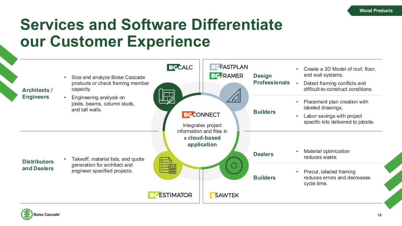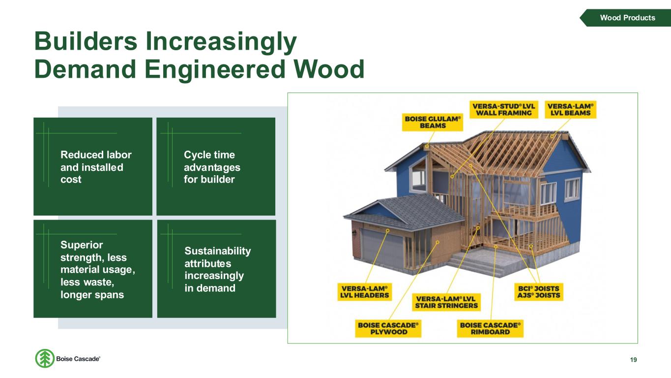 Services and Software Differentiate our Customer Experience 18 Wood Products Architects / Engineers • Size and analyze Boise Cascade products or check framing member capacity. • Engineering analysis on joists, beams, column studs, and tall walls. Distributors and Dealers • Takeoff, material lists, and quote generation for architect and engineer specified projects. Dealers • Material optimization reduces waste. Builders • Precut, labeled framing reduces errors and decreases cycle time. Design Professionals • Create a 3D Model of roof, floor, and wall systems. • Detect framing conflicts and difficult-to-construct conditions. Builders • Placement plan creation with labeled drawings. • Labor savings with project specific kits delivered to jobsite. Integrates project information and files in a cloud-based application