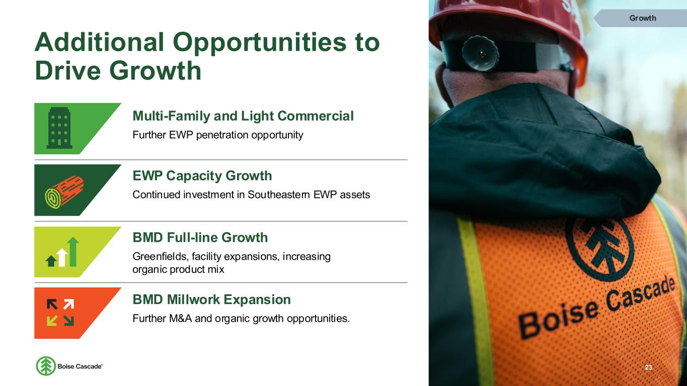 Additional Opportunities to Drive Growth Growth Multi-Family and Light Commercial Further EWP penetration opportunity BMD Full-line Growth Greenfields, facility expansions, increasing organic product mix EWP Capacity Growth Continued investment in Southeastern EWP assets BMD Millwork Expansion Further M&A and organic growth opportunities. 23