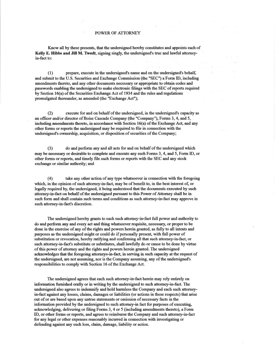 POWER OF ATTORNEY Know all by these presents, that the undersigned hereby constitutes and appoints each of Kelly E. Hibbs and Jill M. Twedt, signing singly, the undersigned's true and lawful attorney- in-fact to: qd) prepare, execute in the undersigned's name and on the undersigned's behalf, and submit to the U.S. Securities and Exchange Commission (the "SEC") a Form ID, including amendments thereto, and any other documents necessary or appropriate to obtain codes and passwords enabling the undersigned to make electronic filings with the SEC of reports required by Section 16(a) of the Securities Exchange Act of 1934 and the rules and regulations promulgated thereunder, as amended (the "Exchange Act"); (2) execute for and on behalf of the undersigned, in the undersigned's capacity as an officer and/or director of Boise Cascade Company (the "Company"), Forms 3, 4, and 5, including amendments thereto, in accordance with Section 16(a) of the Exchange Act, and any other forms or reports the undersigned may be required to file in connection with the undersigned's ownership, acquisition, or disposition of securities of the Company; (3) do and perform any and all acts for and on behalf of the undersigned which may be necessary or desirable to complete and execute any such Forms 3, 4, and 5, Form ID, or other forms or reports, and timely file such forms or reports with the SEC and any stock exchange or similar authority; and (4) take any other action of any type whatsoever in connection with the foregoing which, in the opinion of such attorney-in-fact, may be of benefit to, in the best interest of, or legally required by, the undersigned, it being understood that the documents executed by such attommey-in-fact on behalf of the undersigned pursuant to this Power of Attorney shall be in such form and shall contain such terms and conditions as such attorney-in-fact may approve in such attorney-in-fact's discretion. The undersigned hereby grants to each such attorney-in-fact full power and authority to do and perform any and every act and thing whatsoever requisite, necessary, or proper to be done in the exercise of any of the rights and powers herein granted, as fully to all intents and purposes as the undersigned might or could do if personally present, with full power of substitution or revocation, hereby ratifying and confirming all that such attorney-in-fact, or such attorney-in-fact's substitute or substitutes, shall lawfully do or cause to be done by virtue of this power of attorney and the rights and powers herein granted. The undersigned acknowledges that the foregoing attorneys-in-fact, in serving in such capacity at the request of the undersigned, are not assuming, nor is the Company assuming, any of the undersigned's responsibilities to comply with Section 16 of the Exchange Act. The undersigned agrees that each such attorney-in-fact herein may rely entirely on information fumished orally or in writing by the undersigned to such attorney-in-fact. The undersigned also agrees to indemnify and hold harmless the Company and each such attorney- in-fact against any losses, claims, damages or liabilities (or actions in these respects) that arise out of or are based upon any untrue statements or omission of necessary facts in the information provided by the undersigned to such attorney-in fact for purposes of executing, acknowledging, delivering or filing Forms 3, 4 or 5 (including amendments thereto), a Form ID, or other forms or reports, and agrees to reimburse the Company and such attorney-in-fact for any legal or other expenses reasonably incurred in connection with investigating or defending against any such loss, claim, damage, liability or action.