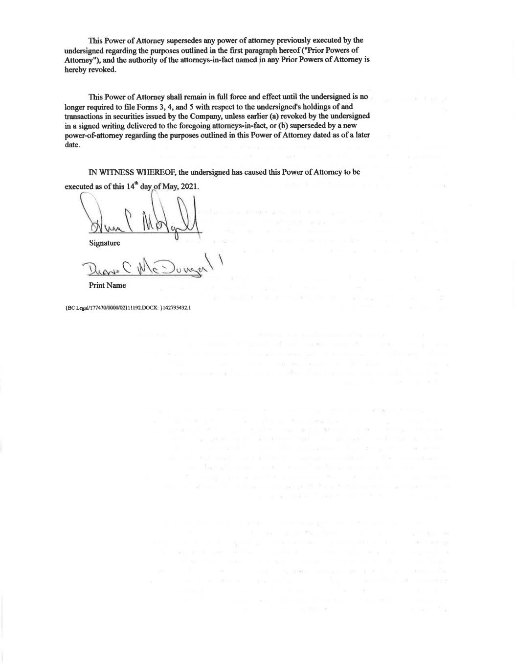 This Power of Attorney supersedes any power of attorney previously executed by the undersigned regarding the purposes outlined in the first paragraph hereof ("Prior Powers of Attorney"), and the authority of the attorneys-in-fact named in any Prior Powers of Attorney is hereby revoked. This Power of Attorney shall remain in full force and effect until the undersigned is no longer required to file Forms 3, 4, and 5 with respect to the undersigned's holdings of and transactions in securities issued by the Company, unless earlier (a) revoked by the undersigned in a signed writing delivered to the foregoing attorneys-in-fact, or (b) superseded by a new power-of-attorney regarding the purposes outlined in this Power of Attomey dated as of a later date. IN WITNESS WHEREOF, the undersigned has caused this Power of Attomey to be executed as of this 14” day of May, 2021. Signature Drow S Down | Print Name {BC Legal/177470/0000/021 11192. DOCK: }142795432.1